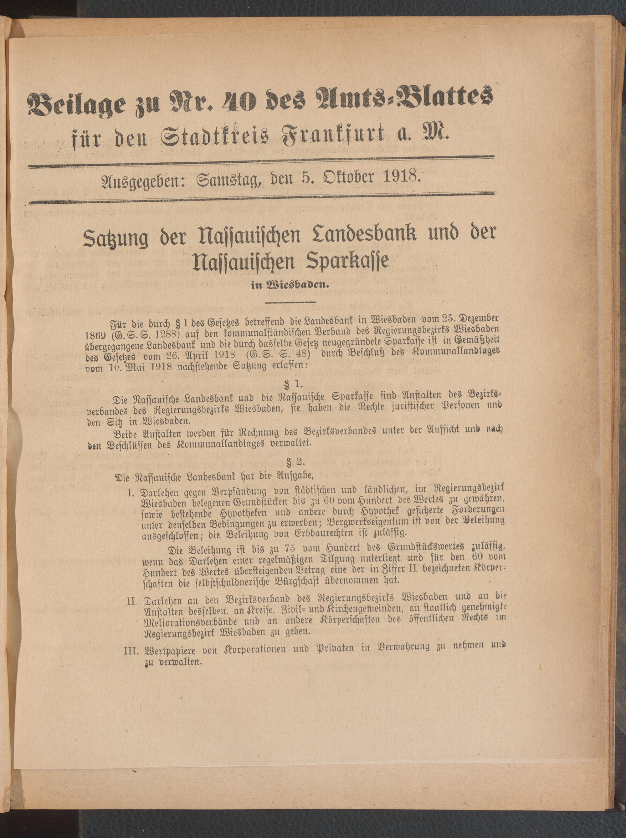 05.10.1918 = Beilage zu Nr. 40. Satzung der Nassauischen Landesbank und der Nassauischen Sparkasse