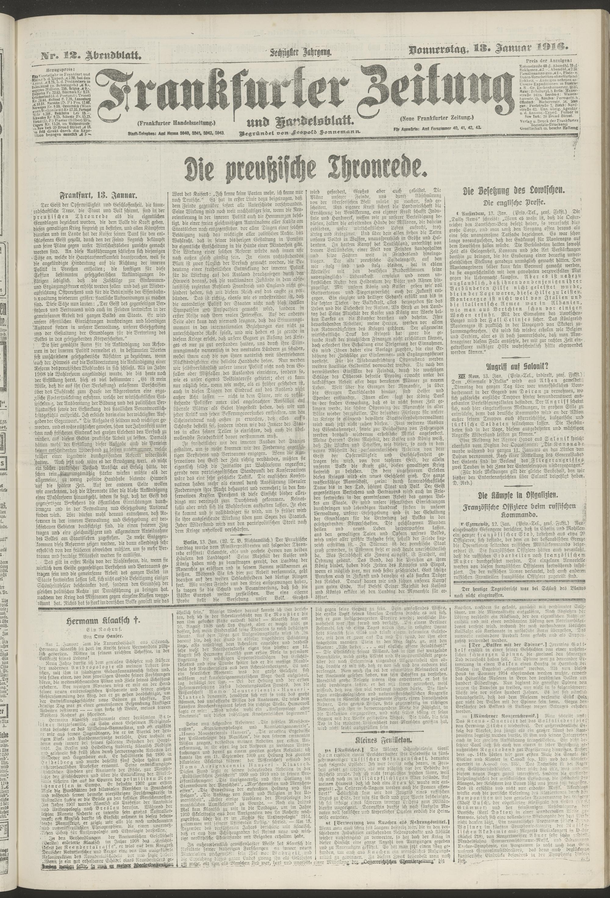 13.01.1916 = Nr. 12. Abendblatt