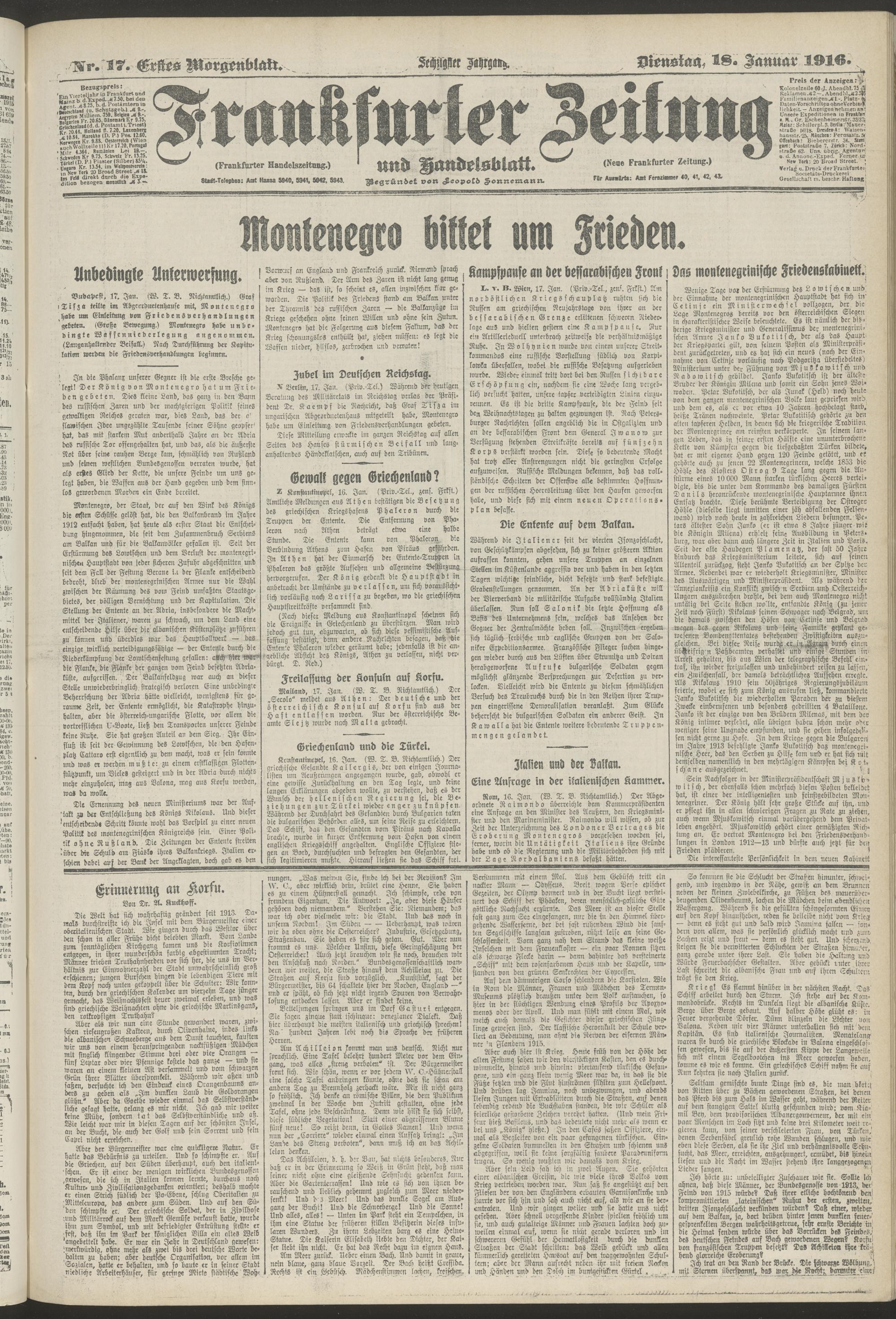 18.01.1916 = Nr. 17. Erstes Morgenblatt