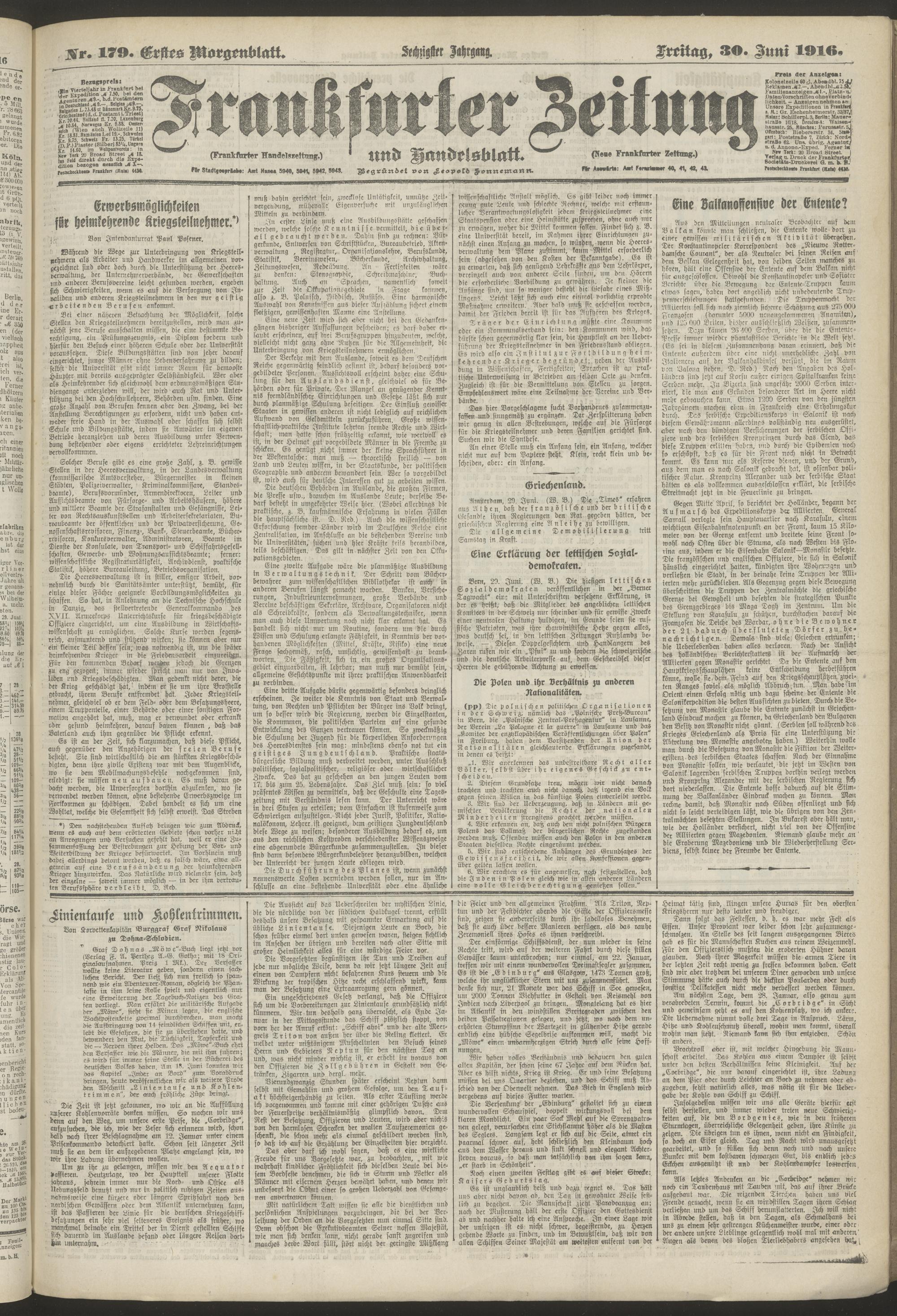 30.06.1916 = Nr. 179. Erstes Morgenblatt