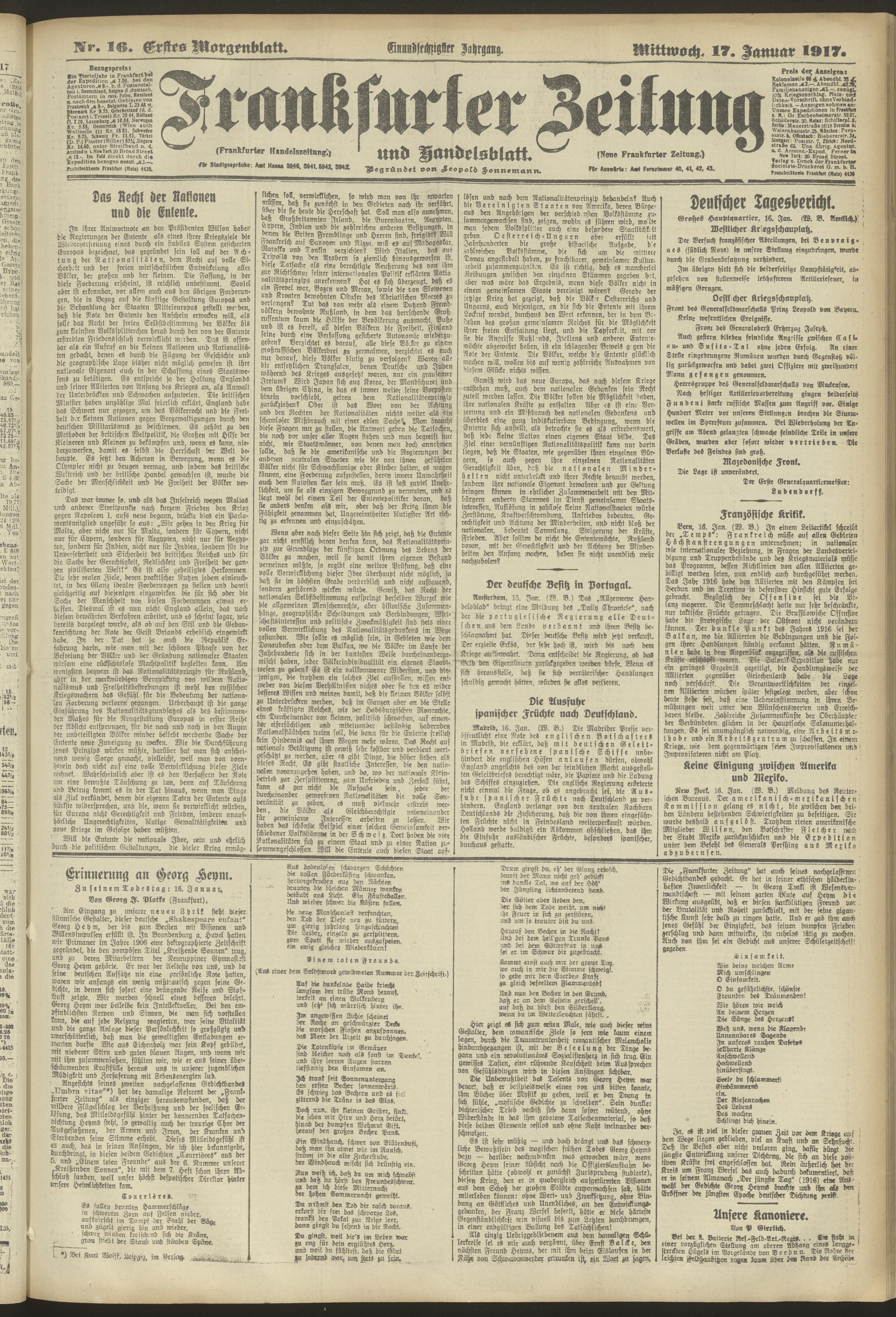 17.01.1917 = Nr. 16. Erstes Morgenblatt