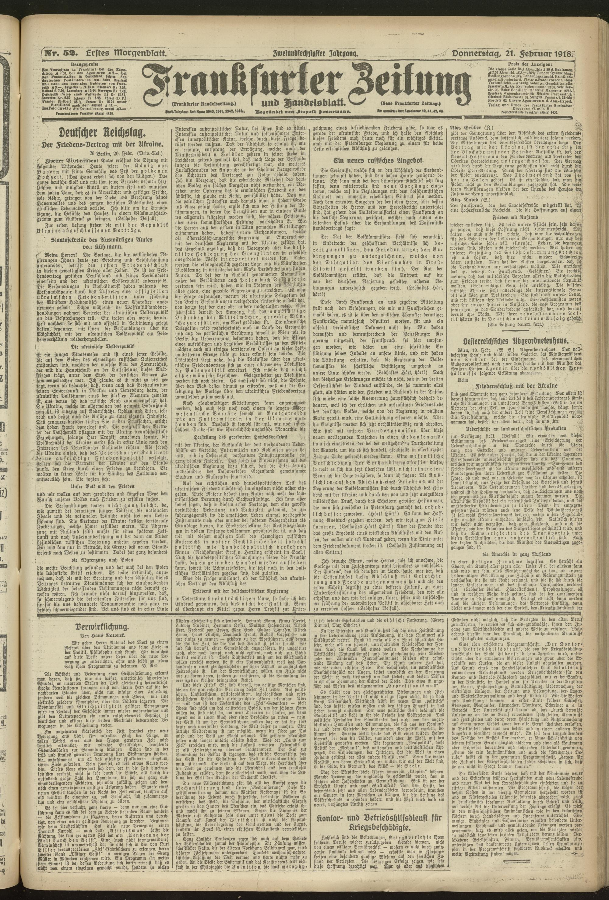 21.02.1918 = Nr. 52. Erstes Morgenblatt