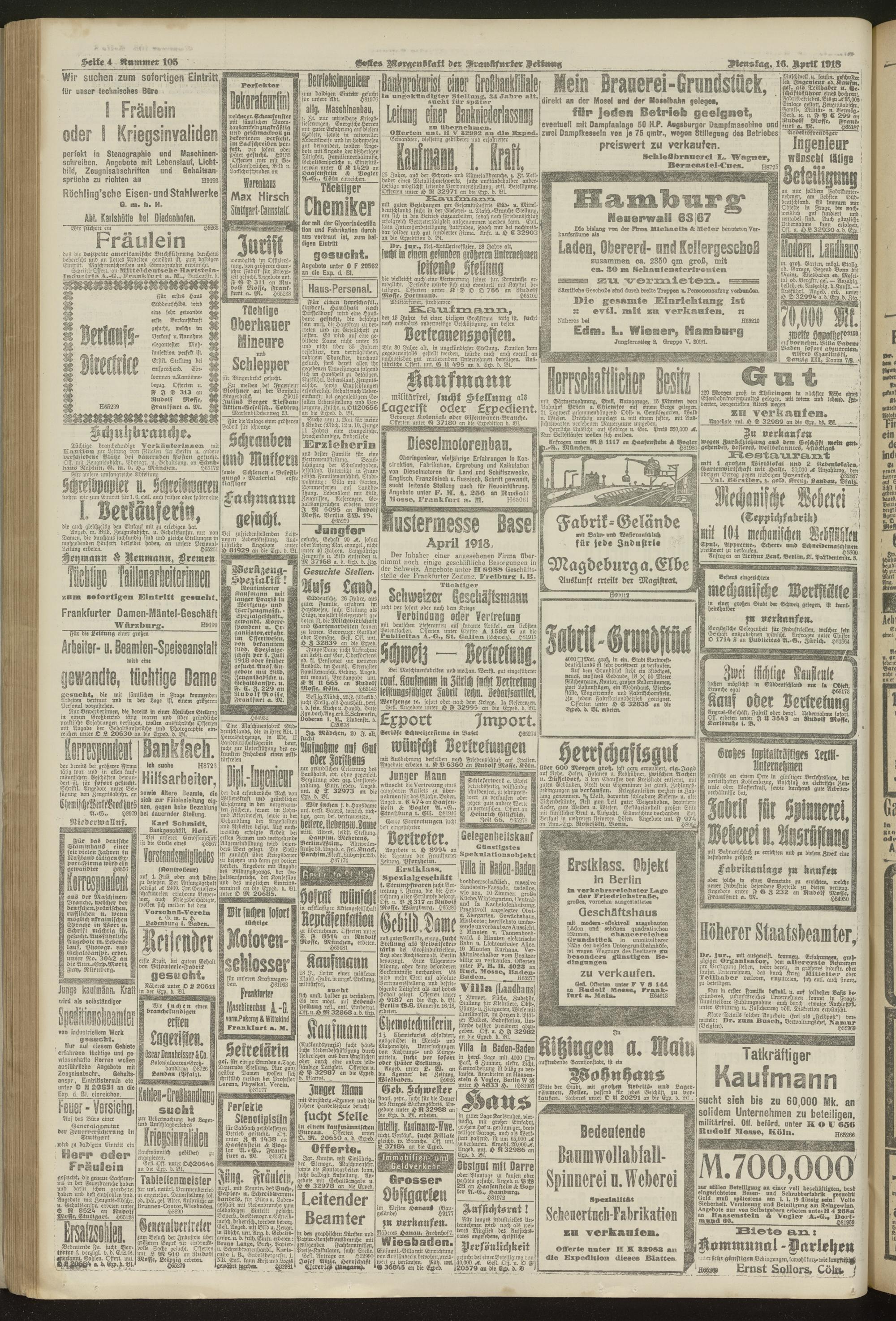 16.04.1918 = Nr. 105. Erstes Morgenblatt