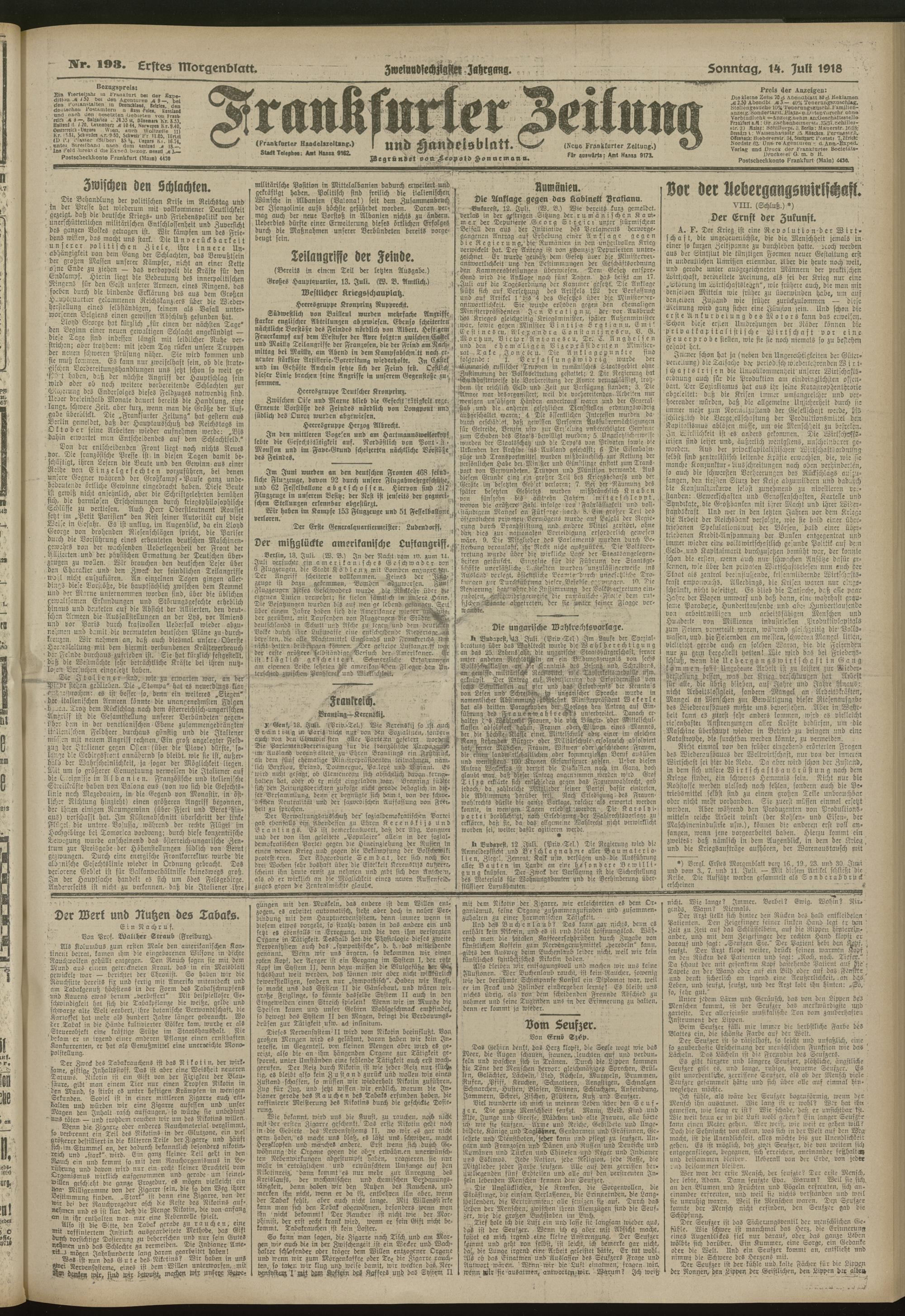 14.07.1918 = Nr. 193. Erstes Morgenblatt