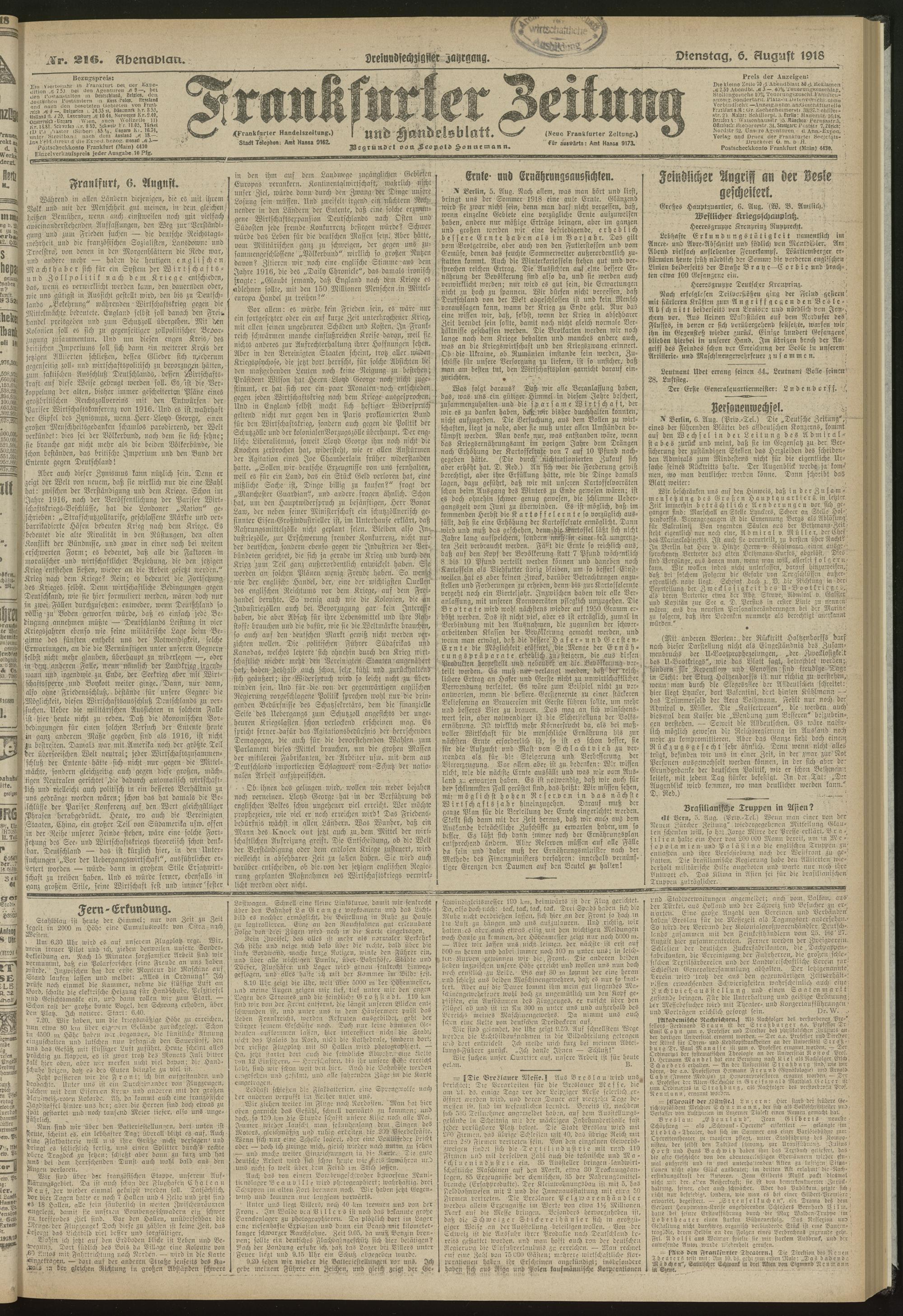 06.08.1918 = Nr. 216. Abendblatt