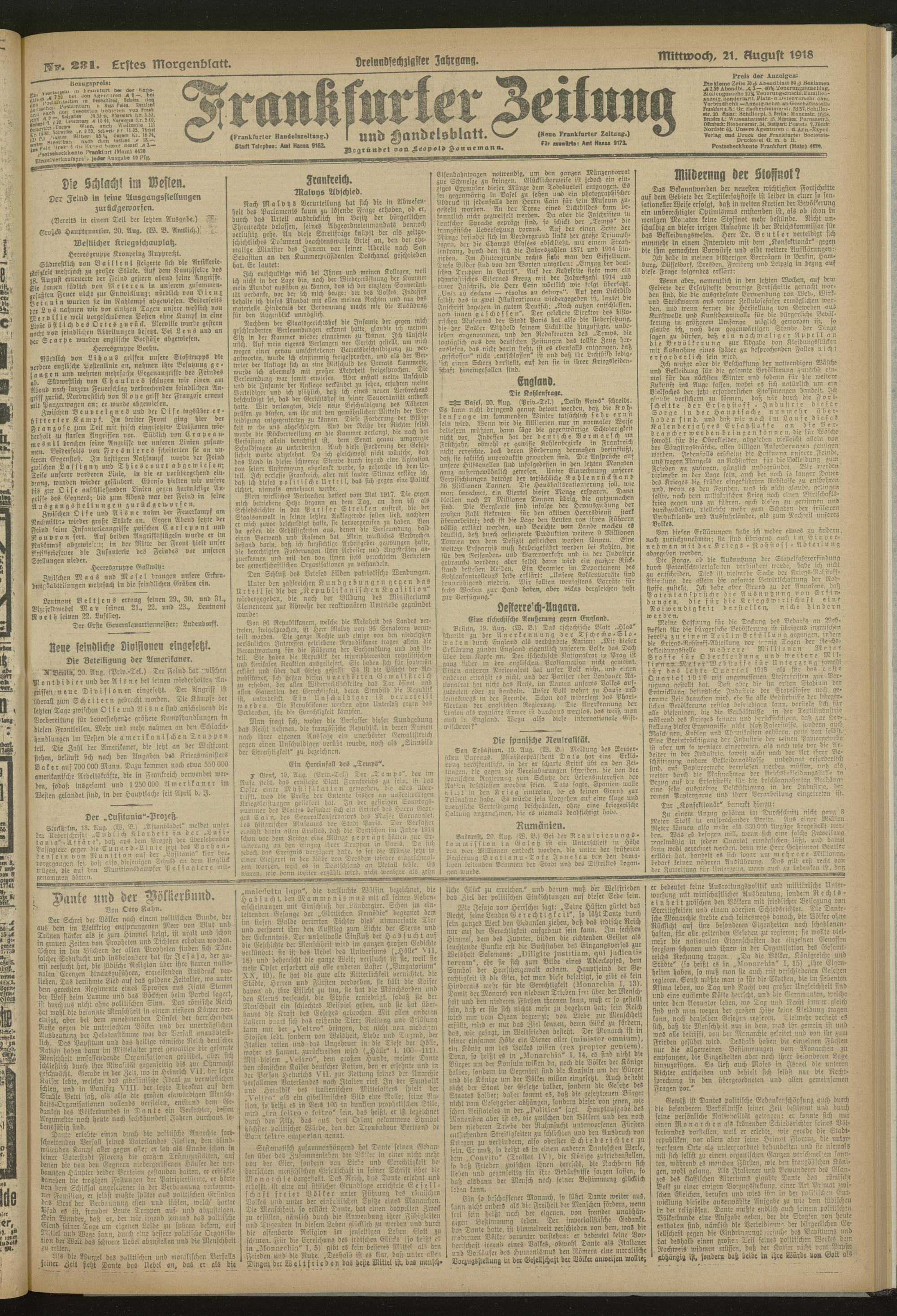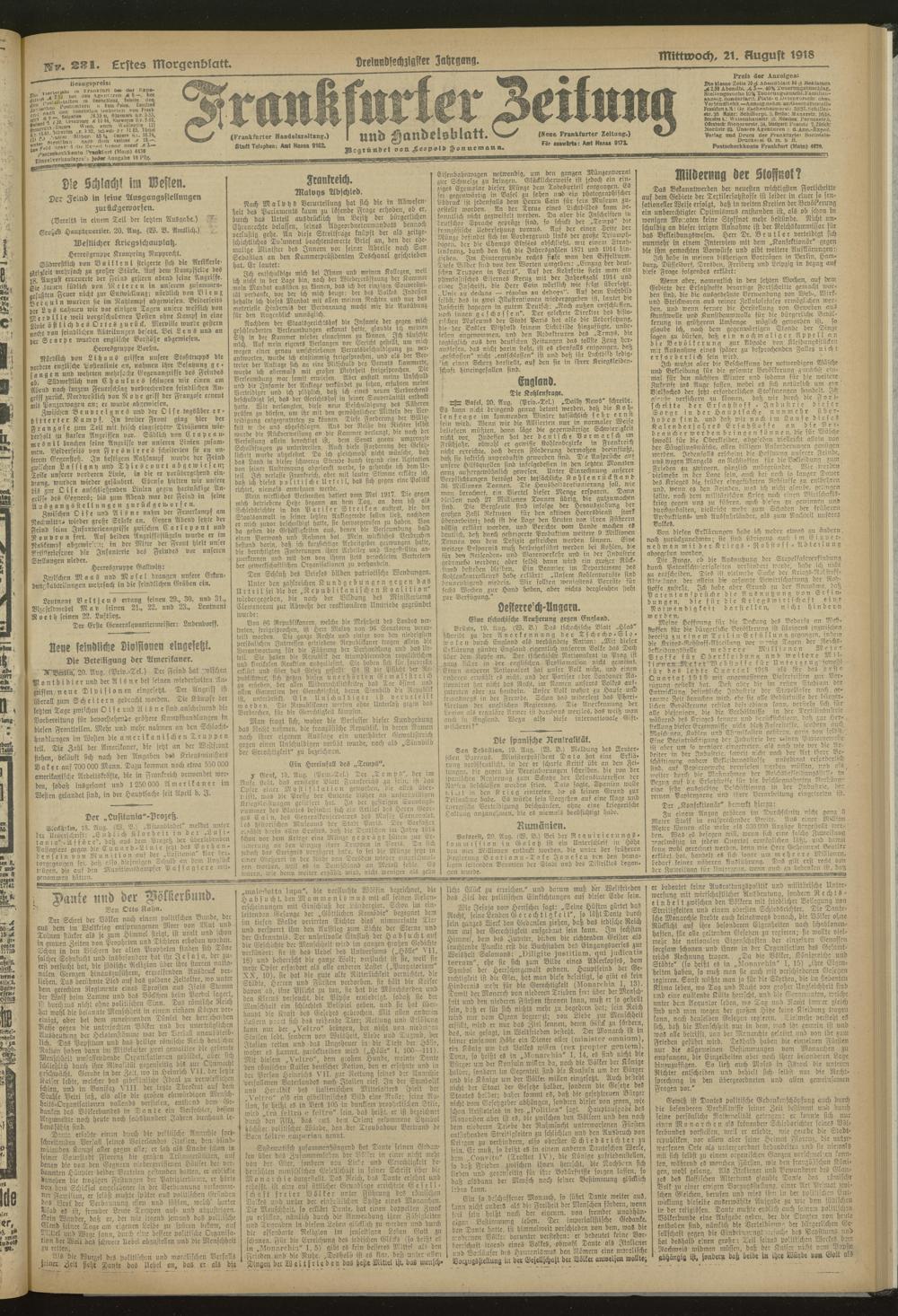 21.08.1918 = Nr. 231. Erstes Morgenblatt