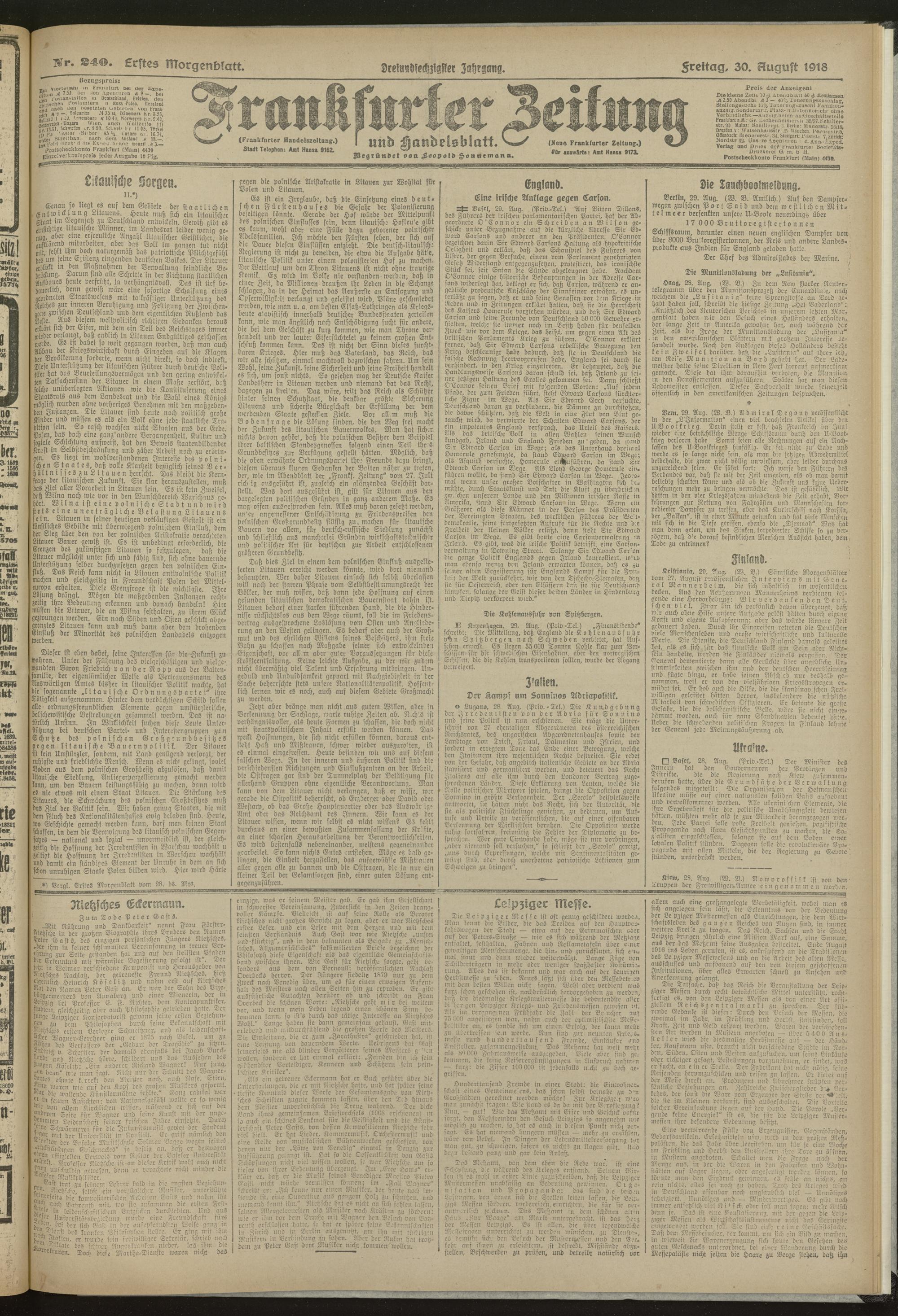 30.08.1918 = Nr. 240. Erstes Morgenblatt