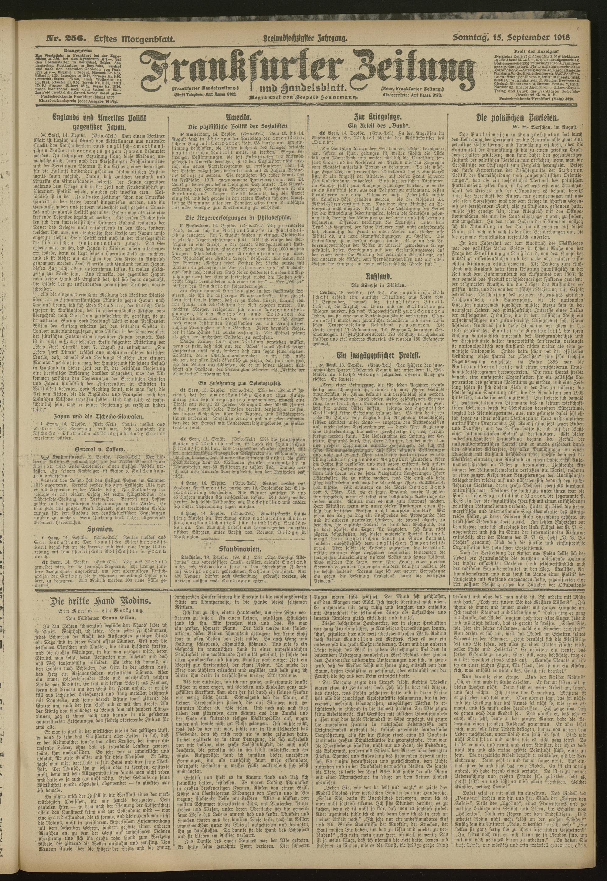 15.09.1918 = Nr. 256. Erstes Morgenblatt