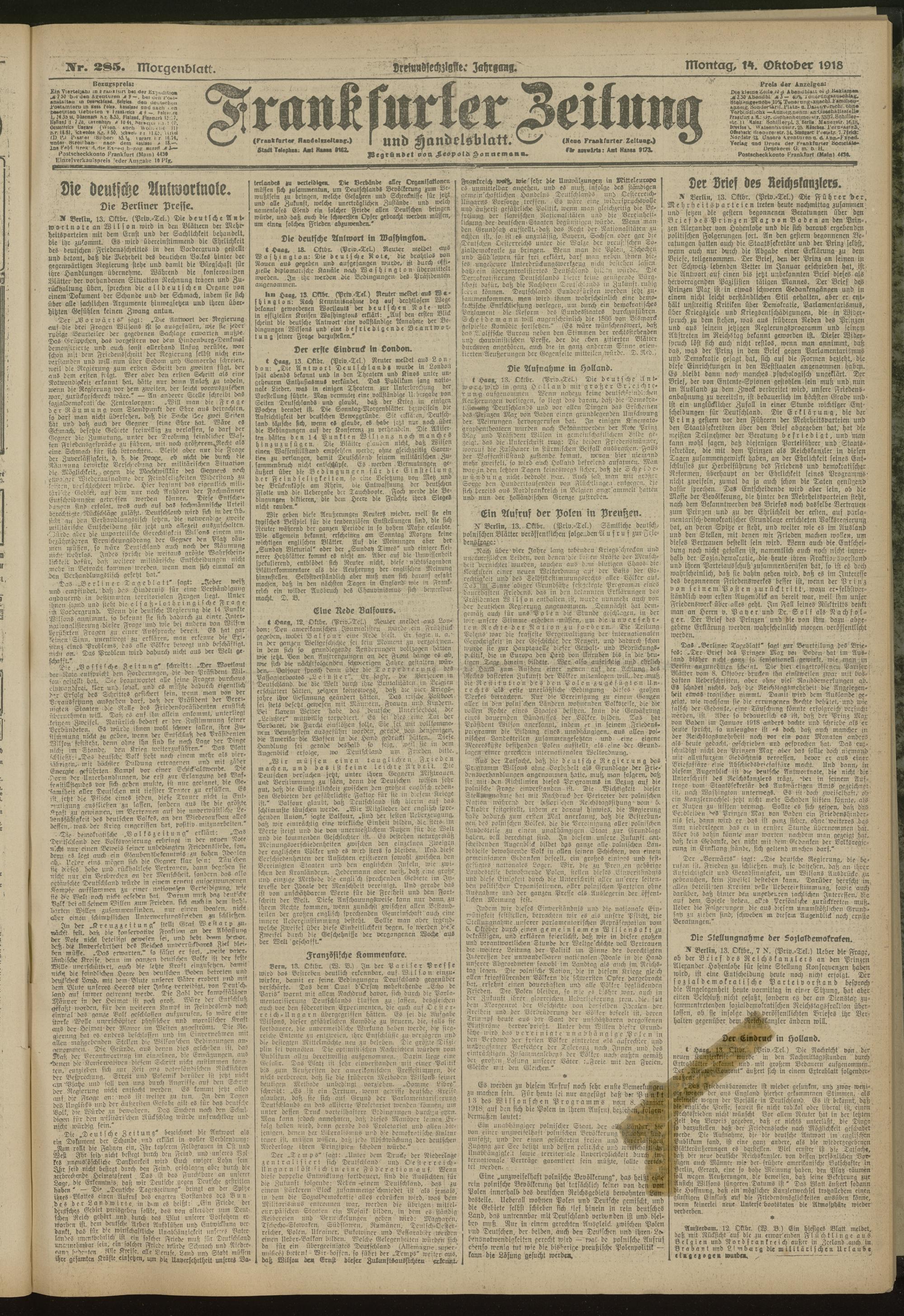 14.10.1918 = Nr. 285. Morgenblatt