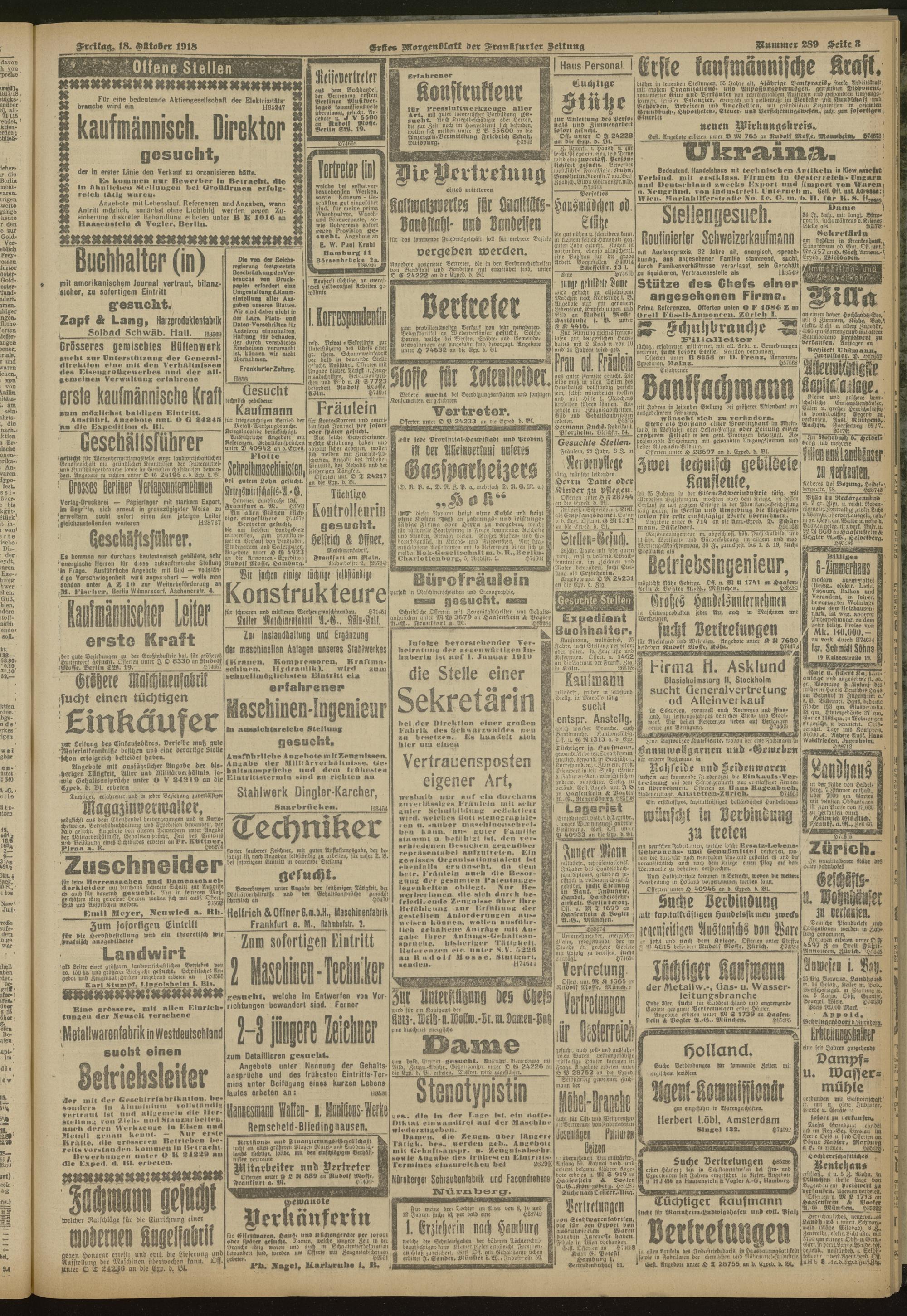 18.10.1918 = Nr. 289. Erstes Morgenblatt