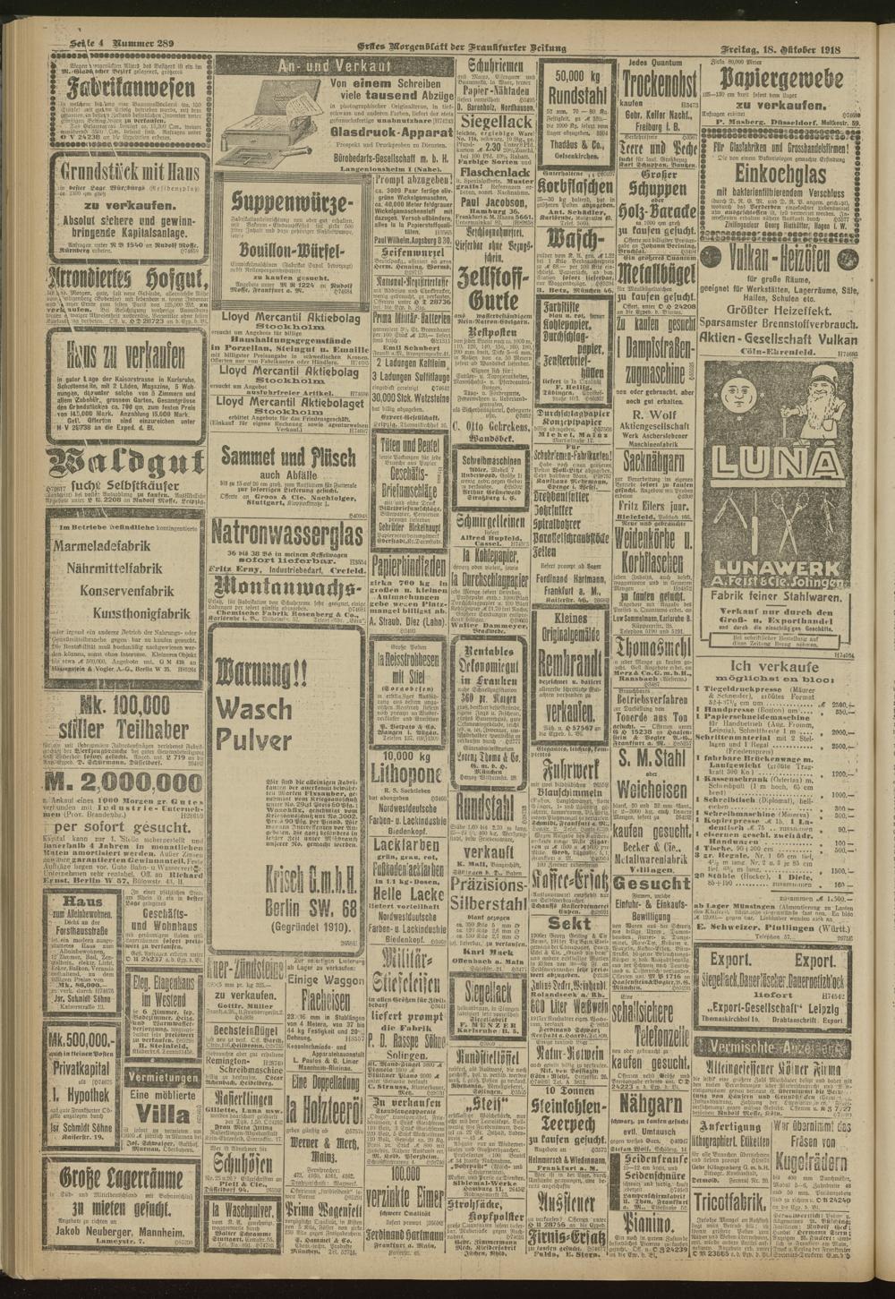 18.10.1918 = Nr. 289. Erstes Morgenblatt