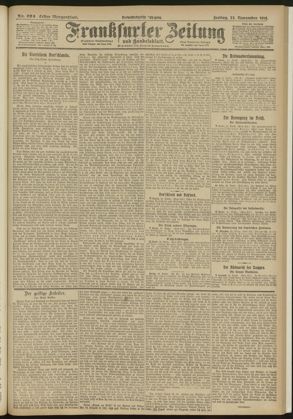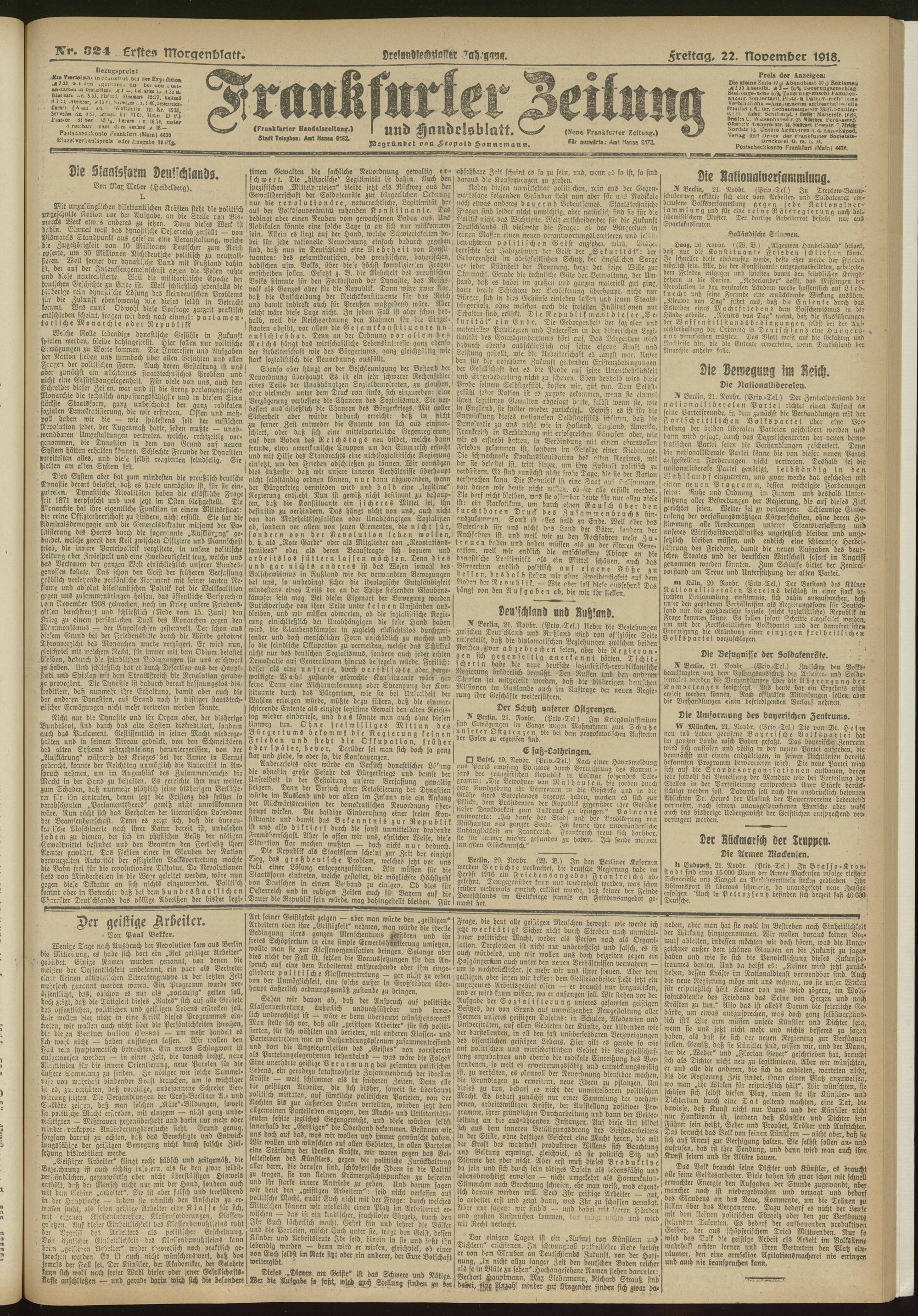 22.11.1918 = Nr. 324. Erstes Morgenblatt