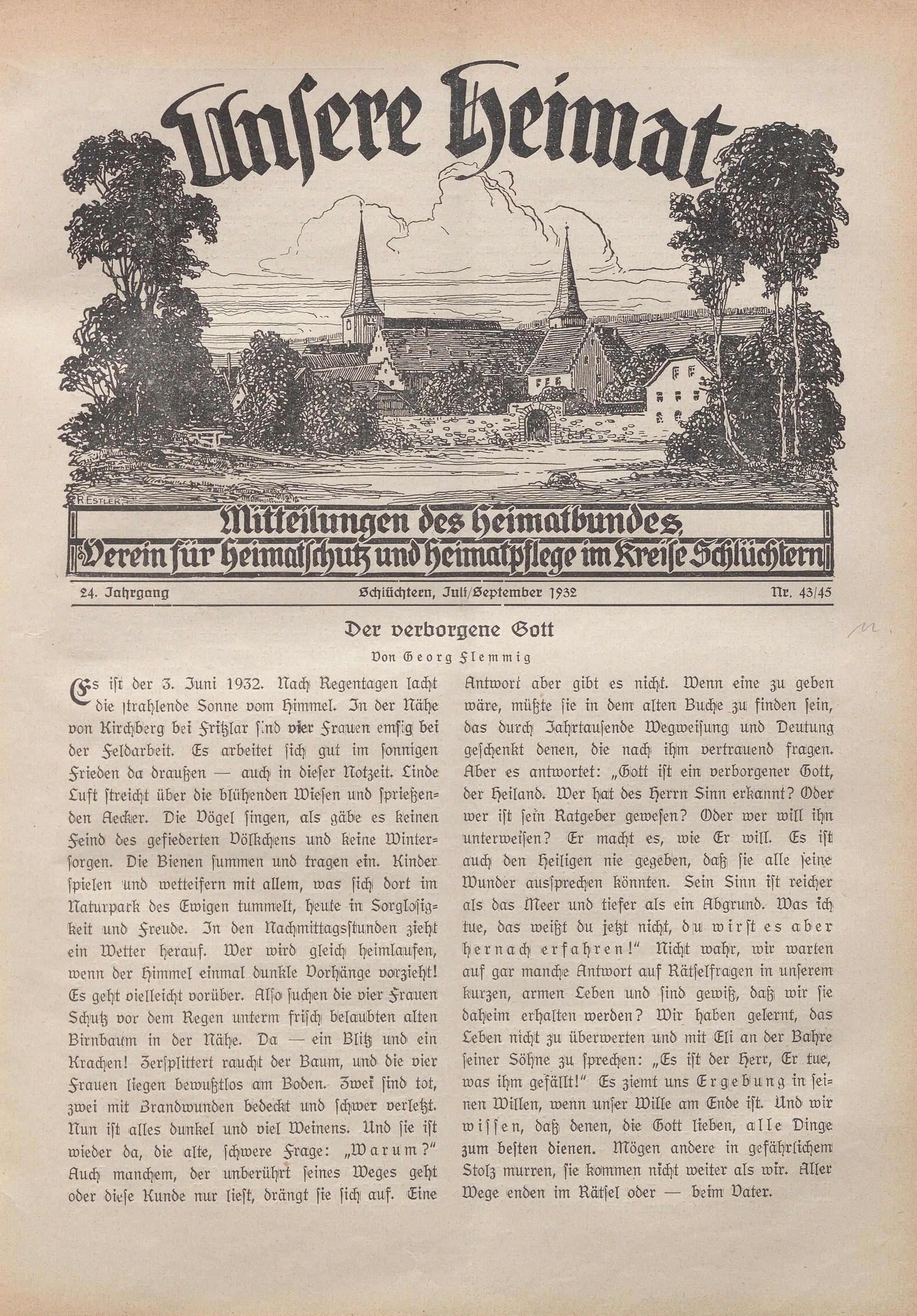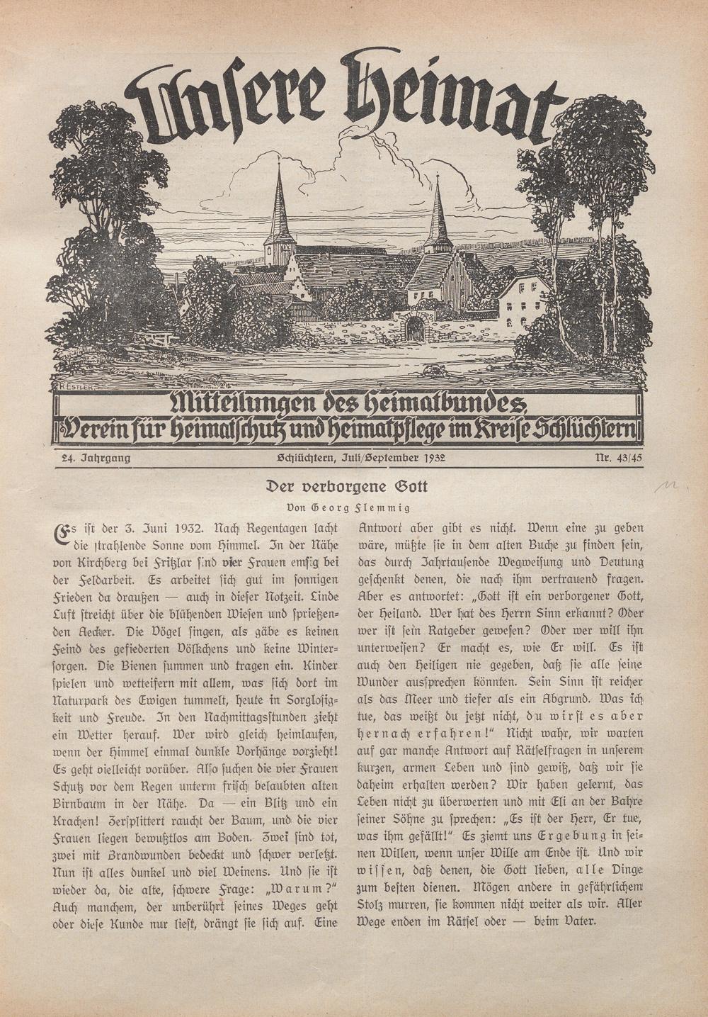 s ist der 3. Juni 1932. Nach Regentagen lacht die strahlende Sonne Dom Himmel. In der Nähe von Nirchberg bei Fritzlar sind vier Stauen emsig bei der Feldarbeit. Es arbeitet sich gut im sonnigen Frieden da draußen — auch in dieser Notzeit. Linde Luft streicht über die blühenden Wiesen und sprießenden Kecker. Die Vögel singen, als gäbe es keinen Feind des gefiederten Völkchens Und keine Winter- sorgen. Die Bienen summen und tragen ein. Ninder spielen und wetteifern mit allem, was sich dort im Naturpark des Ewigen tummelt, heute in Zorglösig- keit und Freude. In den Nachmittagsstunden zieht ein Wetter heraus. Wer wirb1 gleich heimlaufen, wenn der Himmel einmal dunkle Vorhänge DOrye^t! Es geht vielleicht vorüber. Also suchen die vier Frauen Schutz vor dem Regen unterm frisch belaubten alten Birnbaum in der Nähe. Da — ein Blitz und ein Nrachen! Zersplittert raucht der Baum, und die vier Frauen liegen bewußtlos am Boden. Zwei sind tot, zwei mit Brandwunden bedeckt und schwer verletzt. Nun ist alles dunkel und viel Weinens. Und sie ist wieder da, die alte, schwere Frage: „Warum?" Kuch manchem, der unberührt seines Weges geht oder diese Nunde nur liest, drängt sie sich! auf. Eine