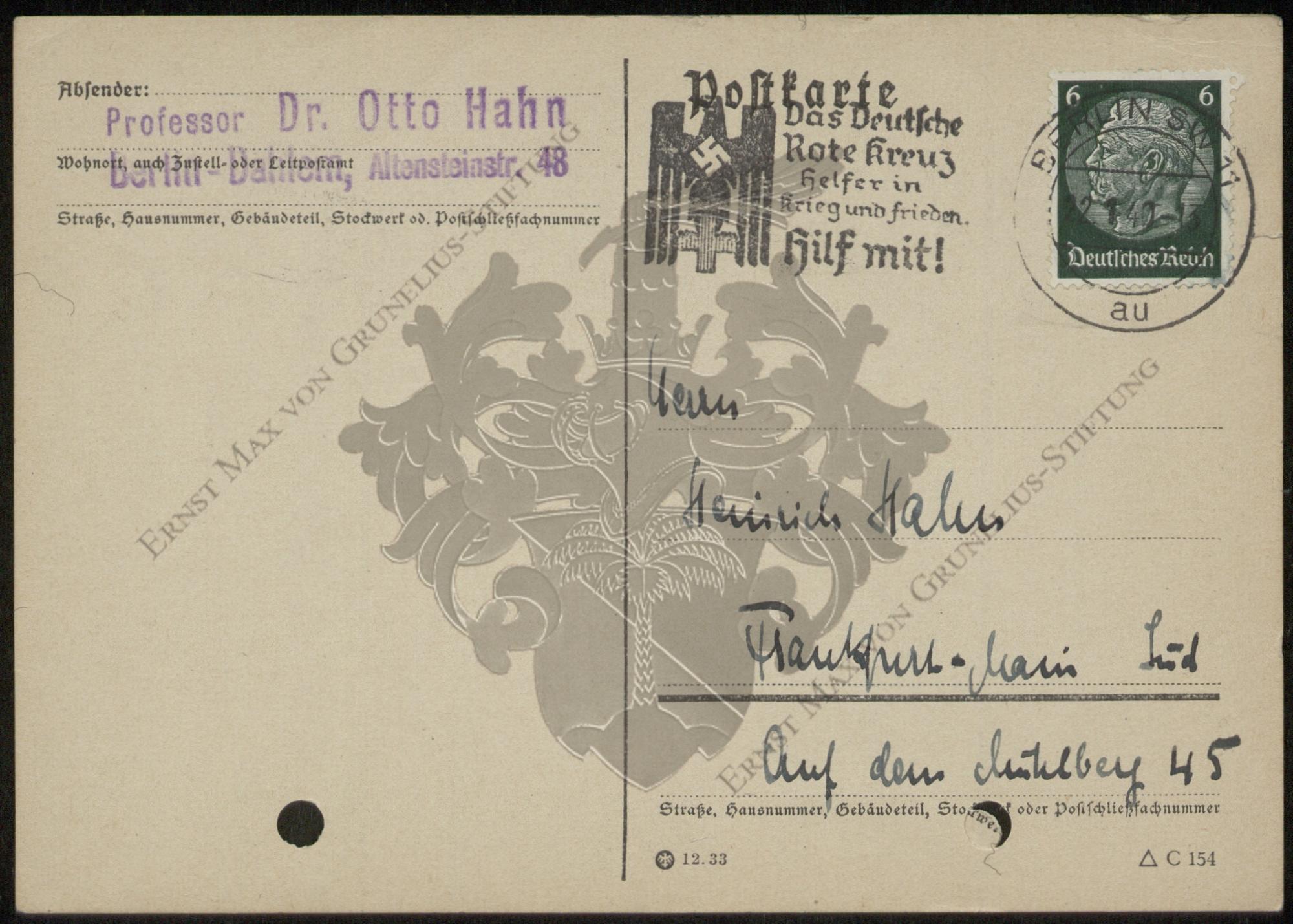 Briefe und Postkarten von Otto Hahn an seinen Bruder Heinrich (Rufname: Heiner) in...