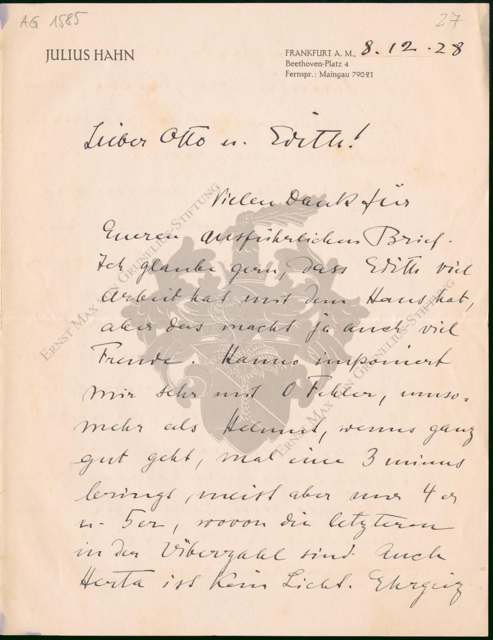 Briefe und Postkarten von Julius Hahn an den Bruder Otto Hahn und an die Schwägerin...
